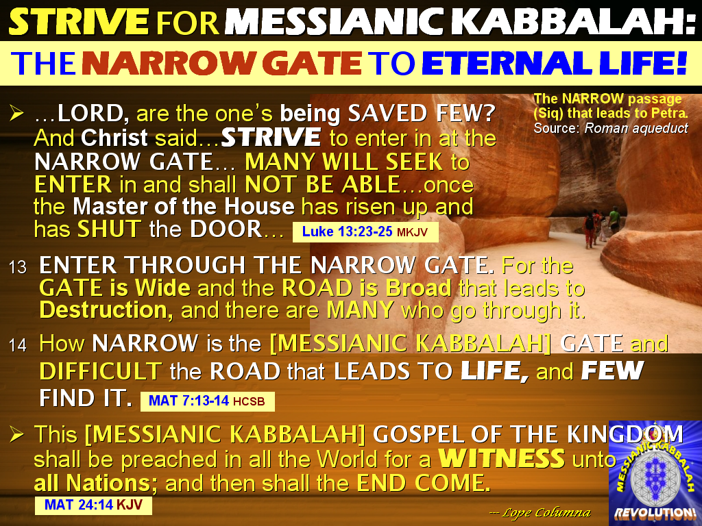 - Because NARROW IS THE [MESSIANIC KABBALAH] GATE and CONSTRICTED is the WAY which leads to LIFE, and there are FEW who find it. (Mat 7:14 MKJV)